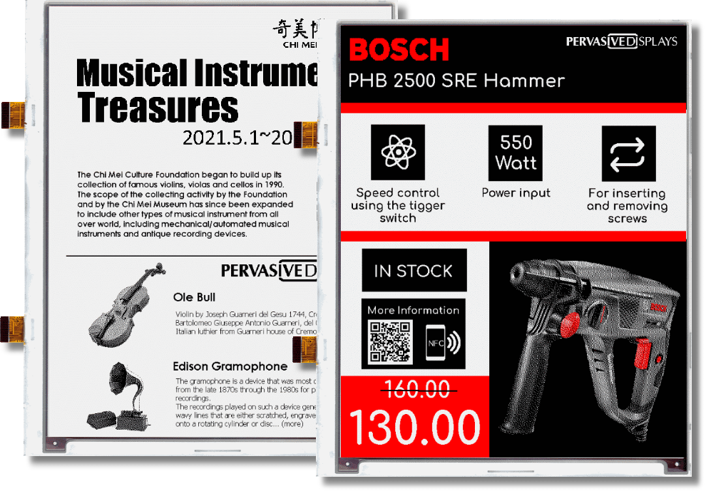 The kits, together with the drivers and the PDLS library suite, provide an easy way to evaluate the e-paper technology from Pervasive Displays. Please note that the evaluation hardware and software are intended for use by product or software developers in a research and development setting. They are not finished products and are not intended to be used as parts or sub-assemblies in any finished product.